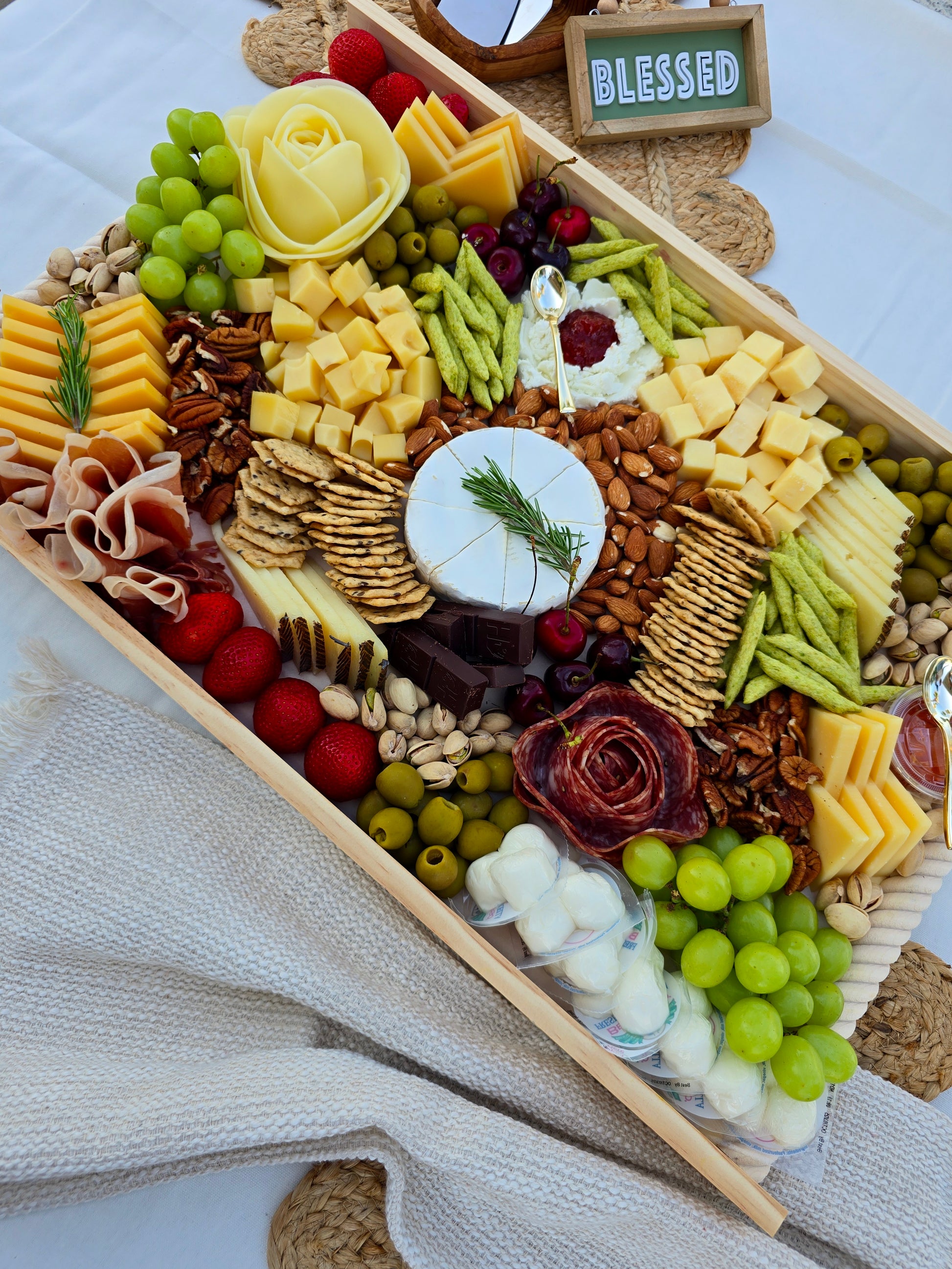 Ingredients: Gouda, Mozzarella, Parmesan, Provolone, Manchego, Jarisberg, Cheddar, President Brie, Cream Cheese, Serrano ham, Salame, Multigrain crackers, Olives, Strawberries, Grapes, Cherries, Almonds, Pistachios, Pecans, Premium spread organic, Honey, Chocolate and Rosemary.